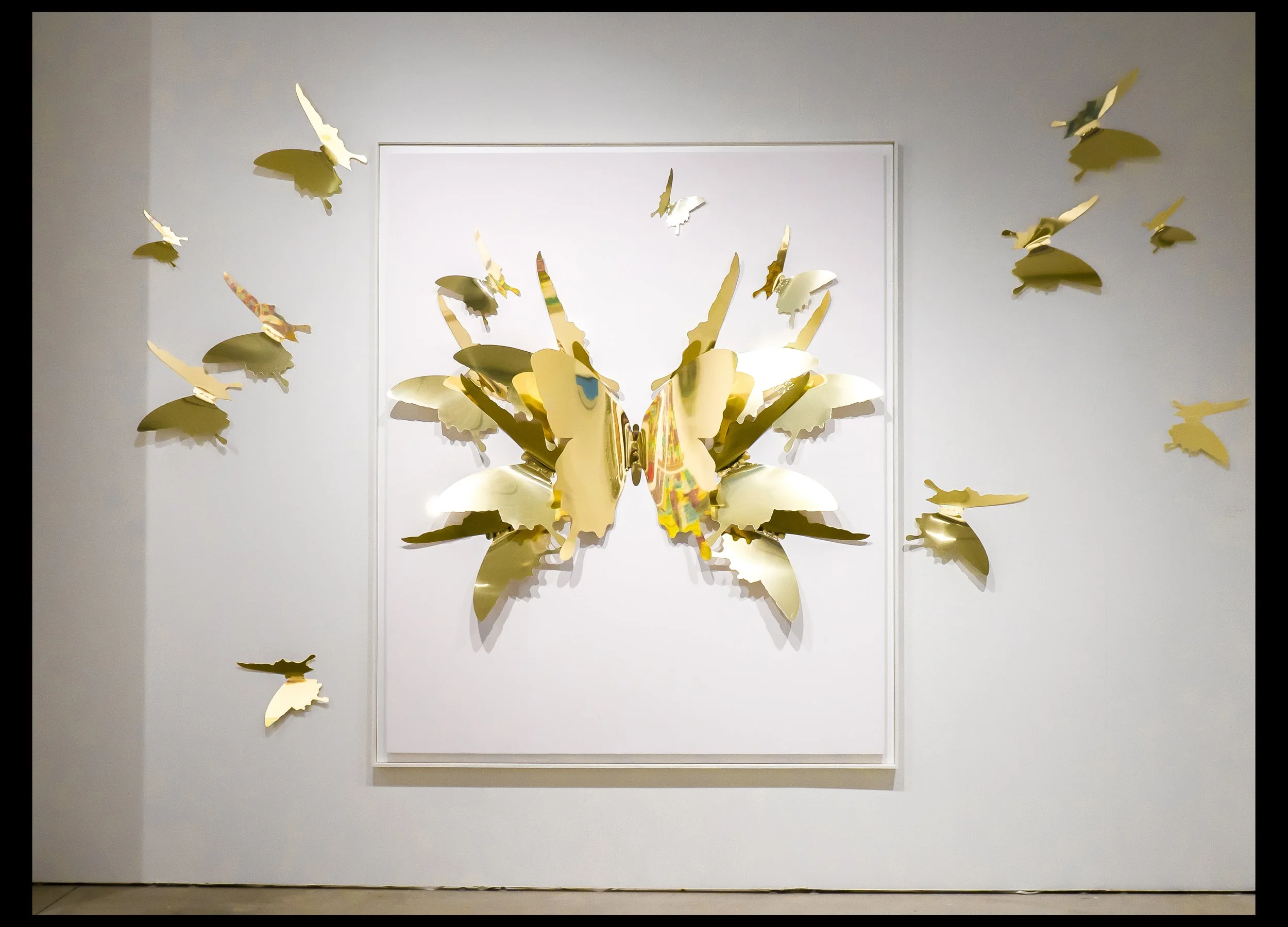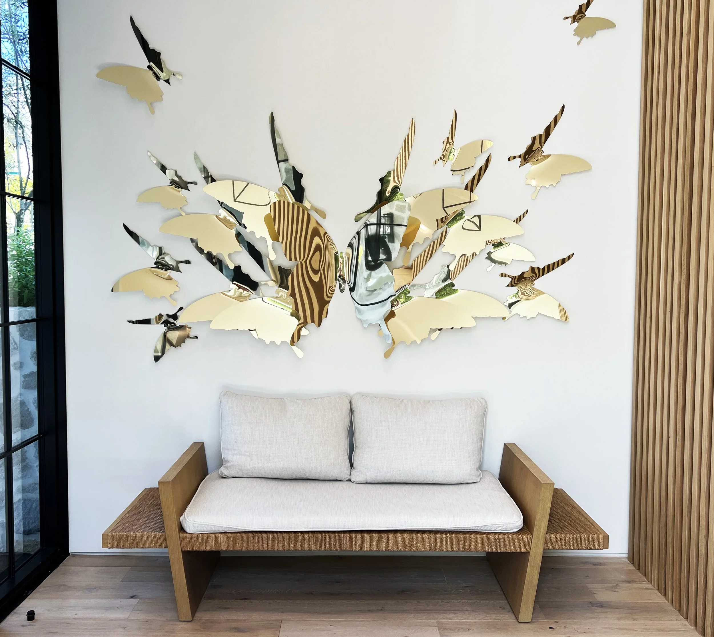 A wall-mounted art installation of golden butterflies with reflective surfaces, creating a three-dimensional butterfly shape in the center with additional butterflies flying outward