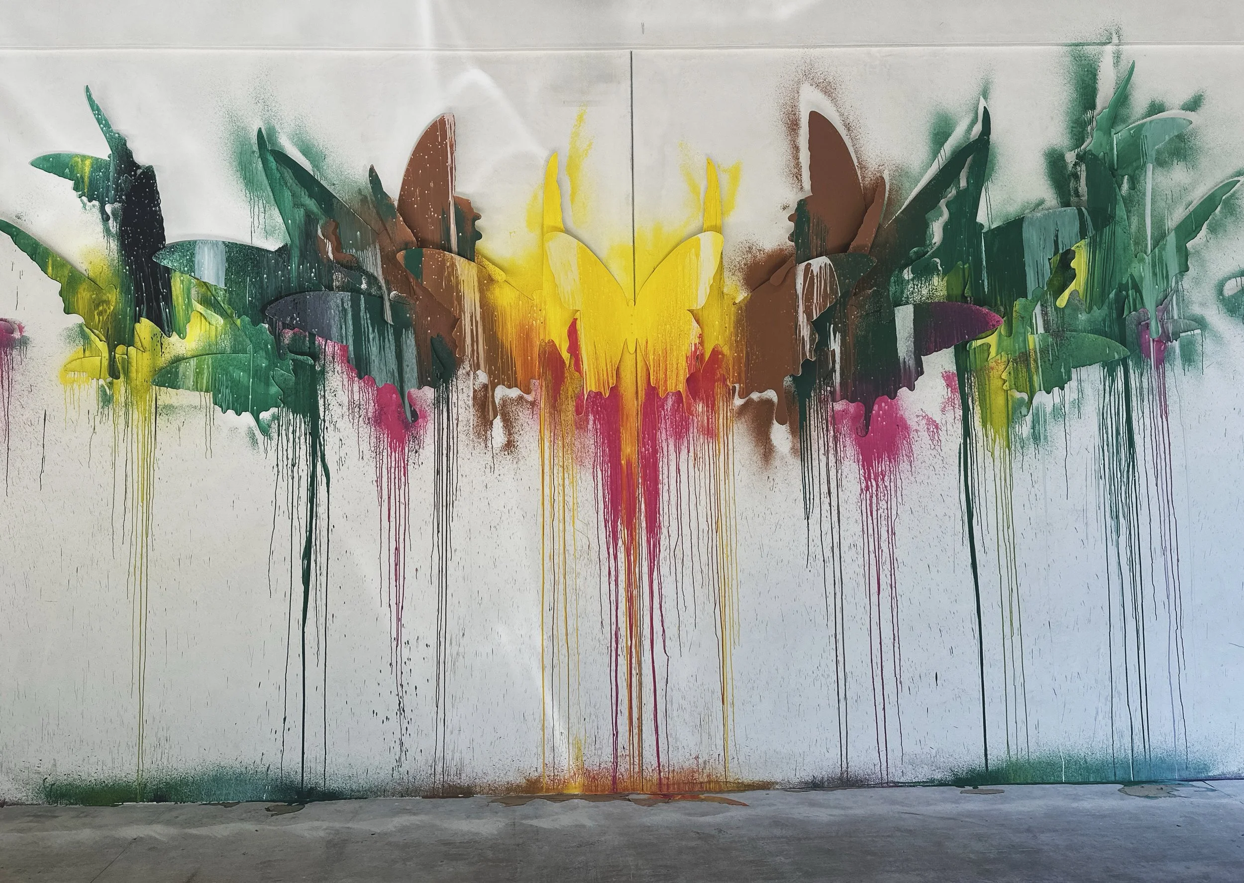 Colorful butterfly graffiti mural with vibrant yellow, pink, green, blue, and brown spray paint on a white wall.