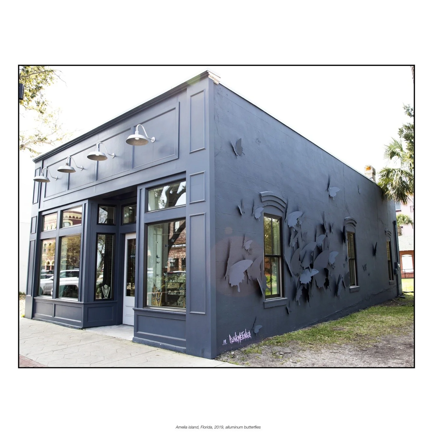 Blue building with aluminum butterfly sculptures on the exterior walls and large front windows, located on a sidewalk in Amelia Island, Florida.