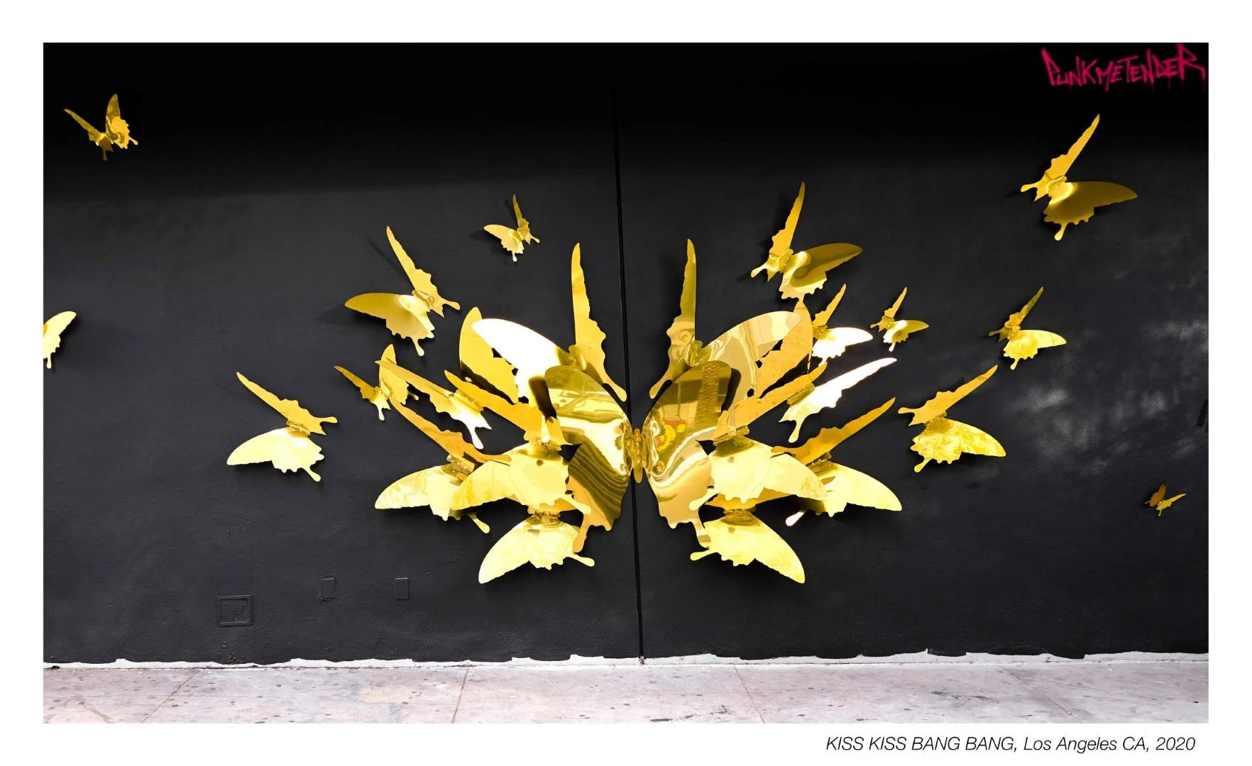 A large gold-colored butterfly sculpture with additional butterflies surrounding it, mounted on a black wall. Located in Los Angeles, CA, 2020.
